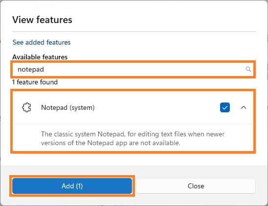 5. Type notepad in the search bar. Find and select Notepad (system) from the list, and then click Add button.