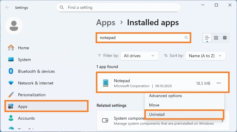3. Find Notepad in the list, click the three dots next to it, and then select Uninstall.