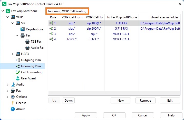 Fax Voip Softphone always checks Incoming VOIP Call Routing rules, starting with the rule # 1. The call will be routed according to the first rule, which satisfies the conditions of the call. All other rules are ignored. If there is no one rule that satisfies the conditions of the call, the call can not be implemented. For example, if rule # 1 applies for all incoming SIP calls ('VOIP Call From' = sip:.*; 'VOIP Call To' = sip:.*), then other rules # 2, # 3, etc. applied to incoming SIP calls never be able to work under any conditions. To be able to receive incoming calls of selected type (SIP or H.323), you must have at least one rule for this type of call in the Incoming VOIP Call Routing table.